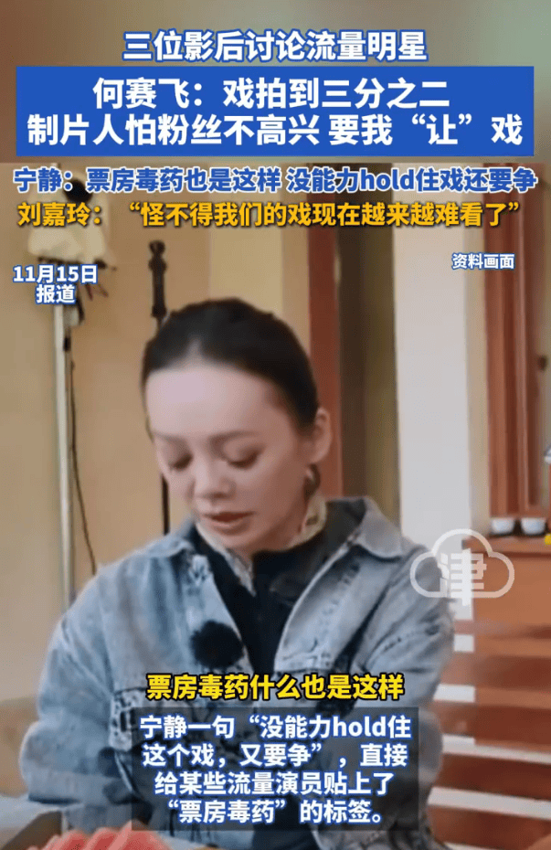 近日,演员何赛飞在综艺节目《一路繁花2》中谈到自己曾被制片人要求让戏的经历。她称:“我之前拍了一部戏,然后演到大概三分之二以后,制片人就跟我说,要我给他让戏,我说我听不懂,不是根据剧本吗?他说粉丝要找他的。”刘嘉玲也在一旁表示:“怪不得我们的戏越来越难看了。”宁静一句“没能力hold住这个戏,又要争”,直接给某些流量演员贴上了“票房毒药”的标签。