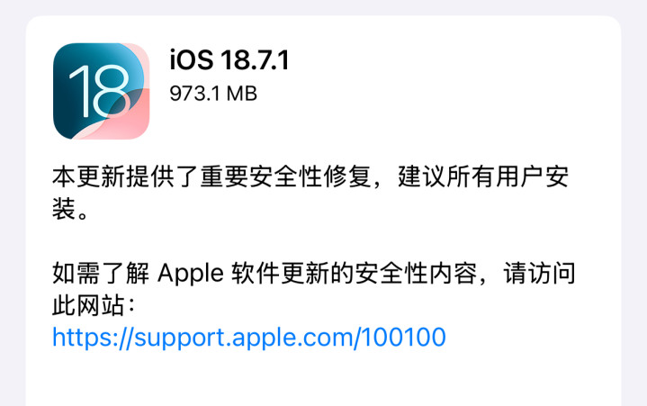 对于仍在使用 iOS 18 系统的用户,苹果也同步推送了 iOS 18.7.1 小版本更新。这部分用户可以选择停留在 iOS 18 或考虑 OTA 升级到最新的 18.7.1,继续稳定地使用旧系统。